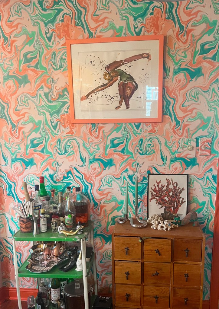 This wallpaper marks multiple strategies. I gave him several options, paid for it, and hung it myself. Wallpaper is from Spoonflower and original artwork is from Minnesota artist Kathy Mommsen.
