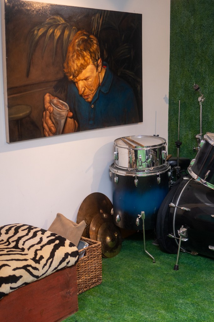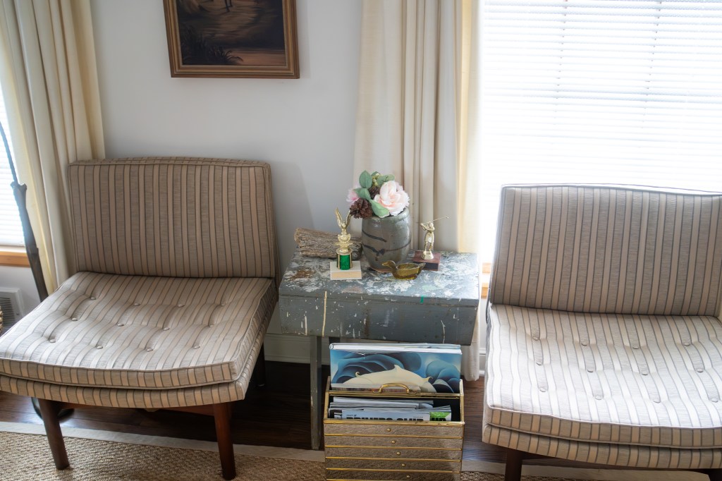 Paula memorialized her living room chairs in this painting, which sits adjacent to her studio in the basement. Photos by Jon Carnes