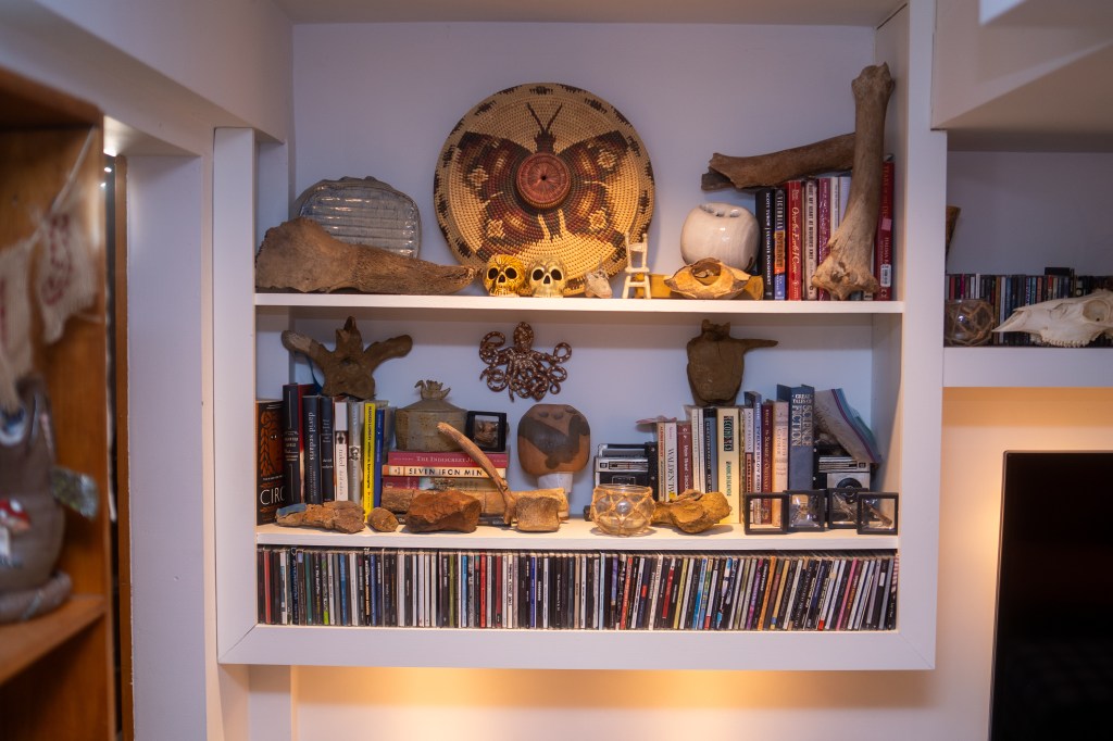 A perfectly curated collection of rocks, bones, skulls, ceramics, wicker, books, and music. Photo by Jon Carnes