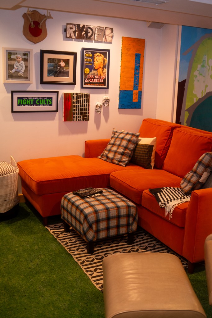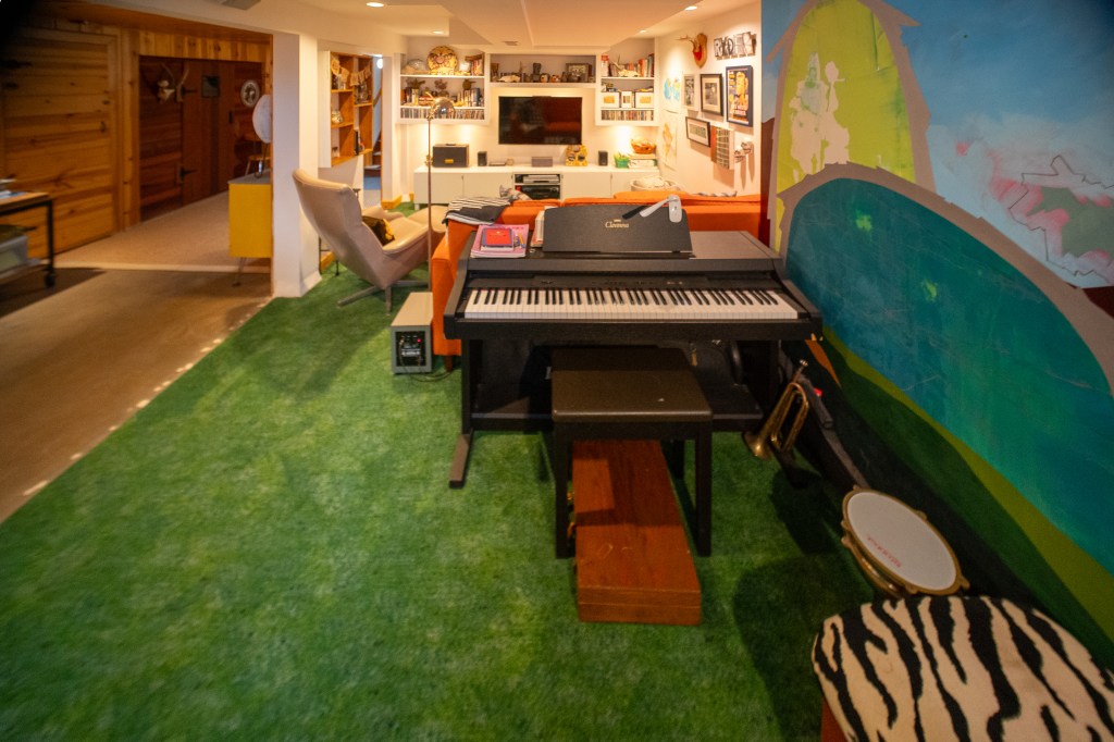 The basement was finished when they moved in. On the opposite side from her studio, there’s a space to watch TV, along with an area for Travis to play piano and the drums. Talk about a truly fun basement. Photos by Jon Carnes