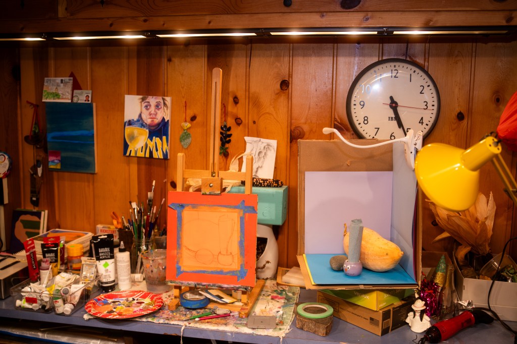 A view of Paula’s art studio in the basement. The cardboard box with the squash and the rock is the inspiration for an in-progress still life painting. Photo by Jon Carnes