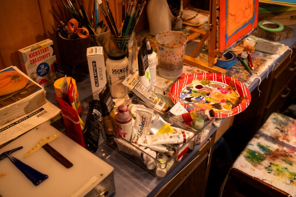 A collection of Paula’s painting supplies with two glass mushrooms on the left. Photo by Jon Carnes