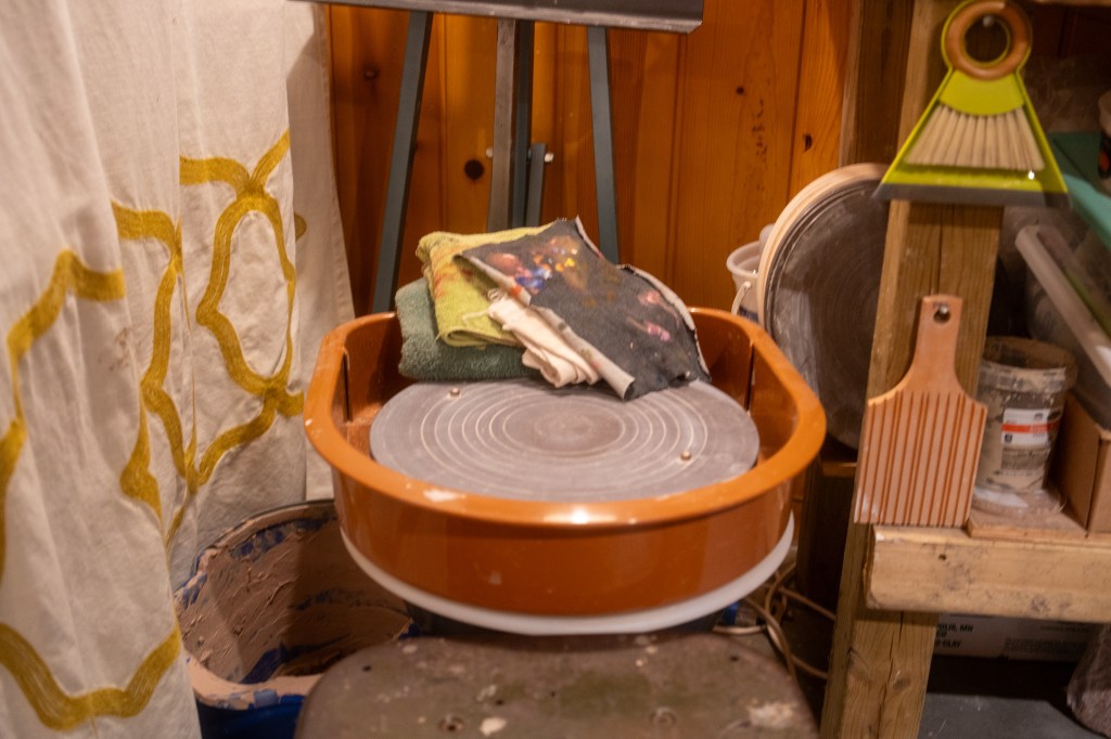 Paula’s potter’s wheel in her basement studio. Photo by Jon Carnes