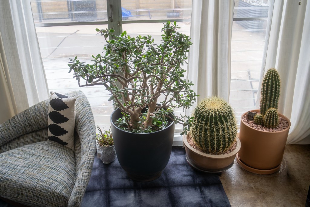 The sunroom houses the family’s growing collection of succulents and cacti. The coffee table is from the famed Swedish design company Dux and was another lucky thrift score. Paula found the triangular-shaped armchair on Facebook Marketplace and had it reupholstered.