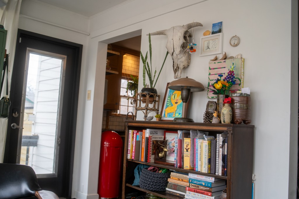 A shelf in the sunroom holds books, art, Lego flowers, and ceramics. It is adjacent to the doorway into the kitchen. Photo by Jon Carnes