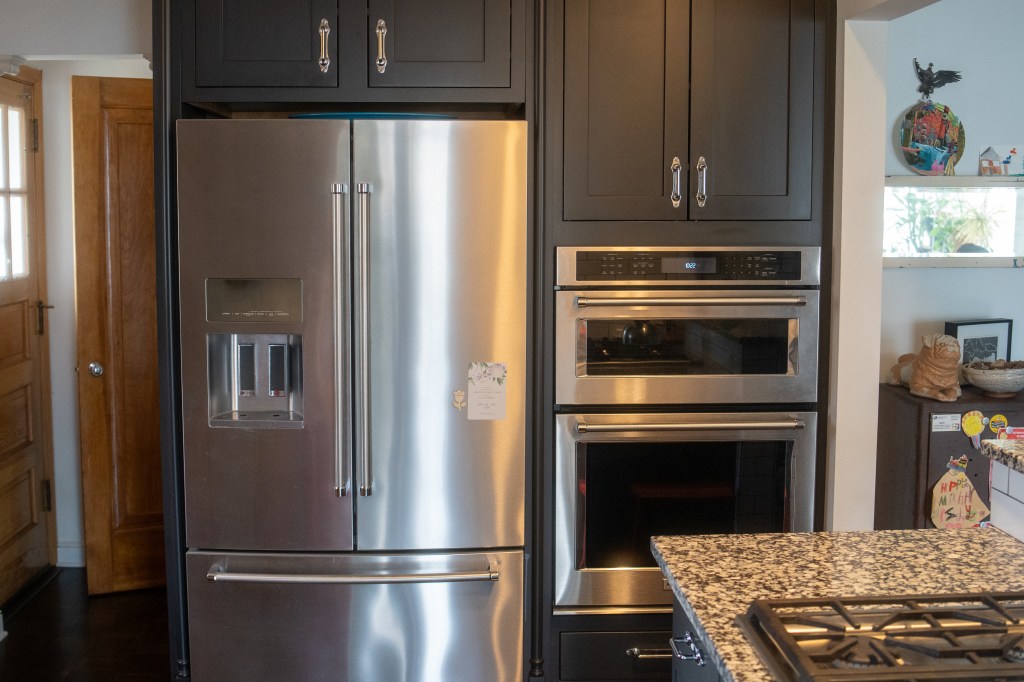 The dark cabinets are new, along with the countertops and the appliances. The cabinet pulls with the backplates are from Rejuvenation. Photo by Jon Carnes