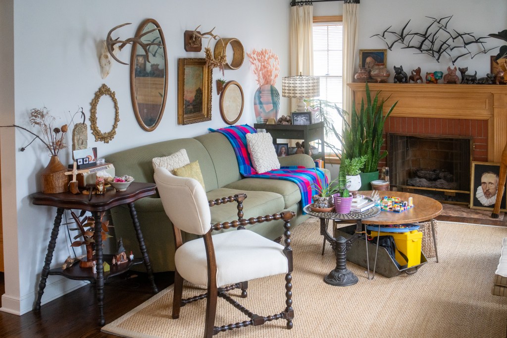 The living room in Paula and Travis’s home has many natural elements, art, inherited furniture, and collections of both daughter and mom. Photo by Jon Carnes