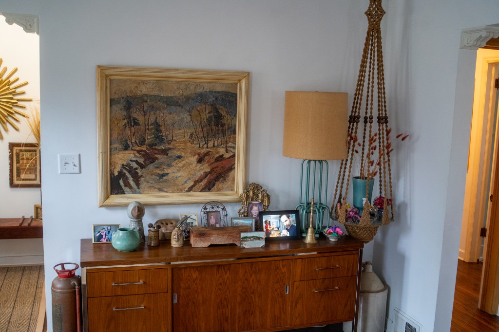 A midcentury modern buffet table with photos, ceramics, and a striking turquoise lamp. The hanging macrame table has one of Ivy’s Precious Moments figurines. Photo by Jon Carnes