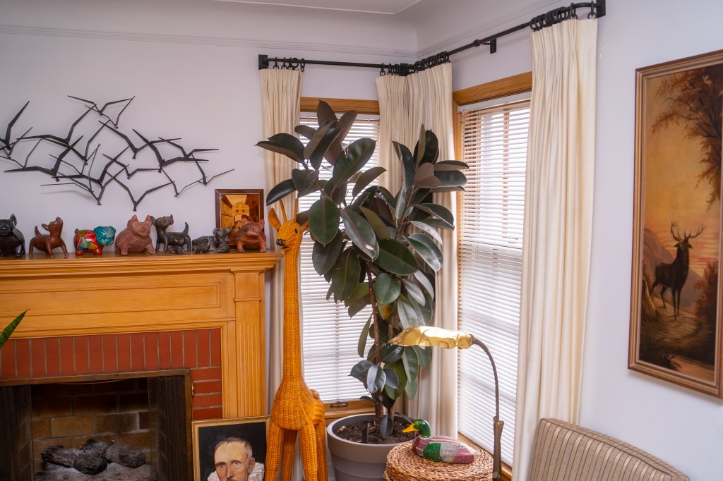 In the living room, a five-foot-tall wicker giraffe stands next to a collection of Colima dogs on the fireplace mantel. Paula started collecting the Colima dogs on her first trip to Oaxaca, Mexico. Every time she goes back to Oaxaca, she brings one back.