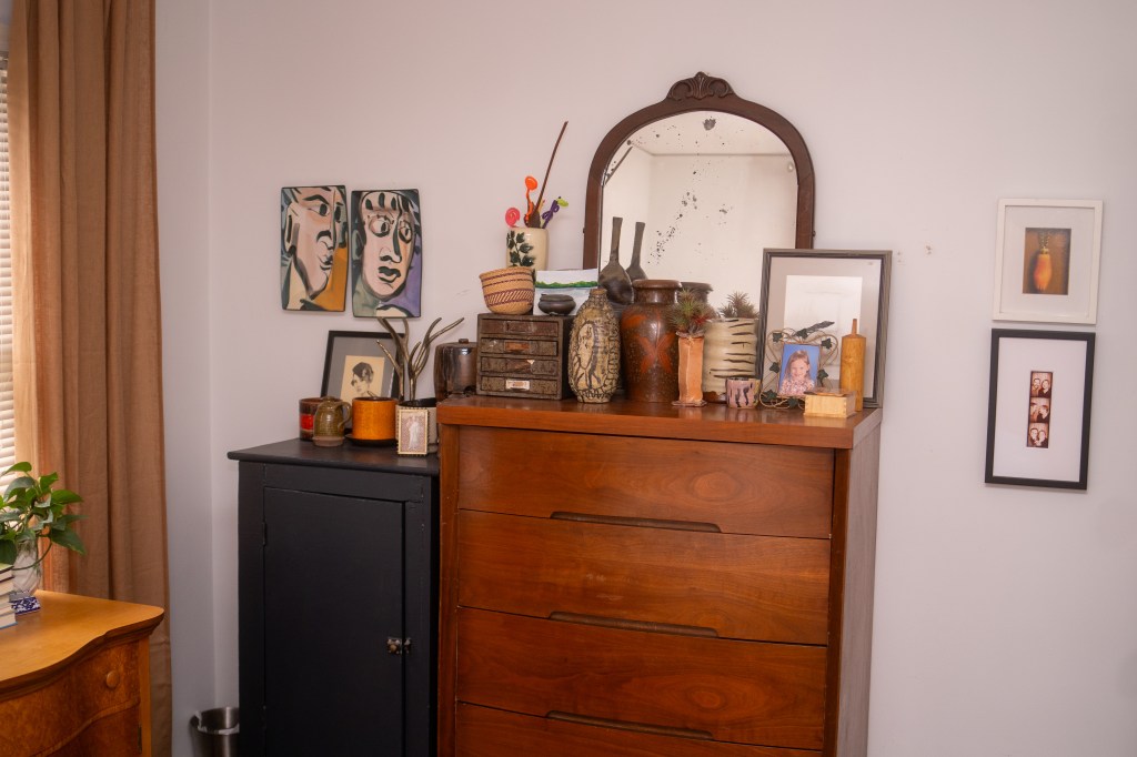 Paula Brandel Ryder lives in a three-bedroom, one bathroom Cape Cod-style home in Robbinsdale with her husband, Travis, her daughter Ivy, and their elderly pug, Mavis. Their home is a blend of industrial and midcentury modern style, and it’s filled with sculptures, ceramics, paintings, and other art.