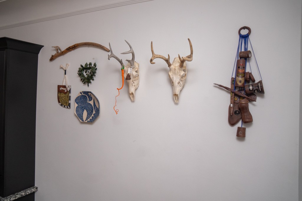 On the wall behind their dining room table—a thrift find—a collection of sculptural art and objects hang, including two deer skulls and a branch. The sculptural ceramic piece on the right is Paula’s art. The collection of ceramic pieces hang on blue string, and it almost looks like parts of a person strung together.