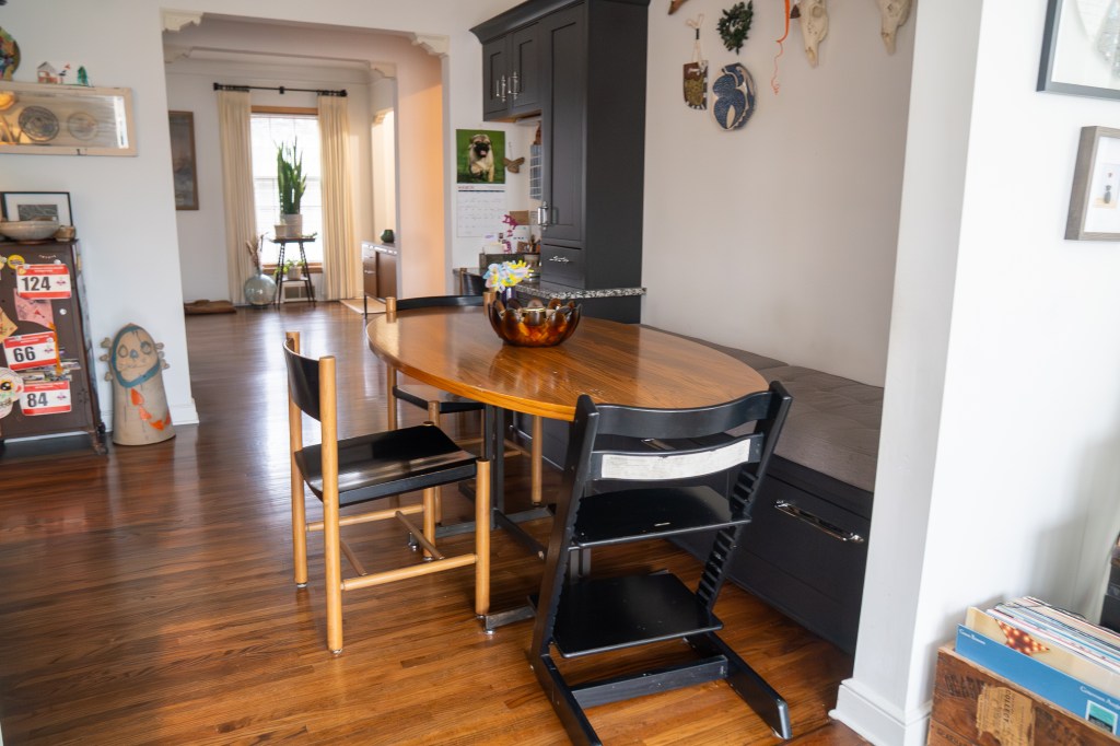 Paula and Travis renovated the sunroom, kitchen, and dining room in 2015, opening up the wall between the dining room and sunroom. They also added more cabinets to the kitchen and dining room, new hardware from Rejuvenation, new lighting, and counters.