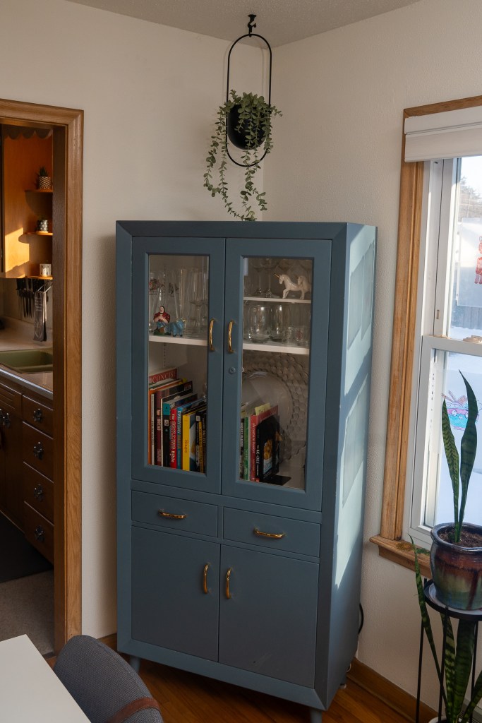 Dan also suggests you try re-imagining pieces from their original use. The “china cabinet” in his dining room is an old medical cabinet. It now houses Dan’s glassware, cookbooks, and other serving ware. He painted the metal cabinet a cornflower blue, added feet, and switched out the pulls.