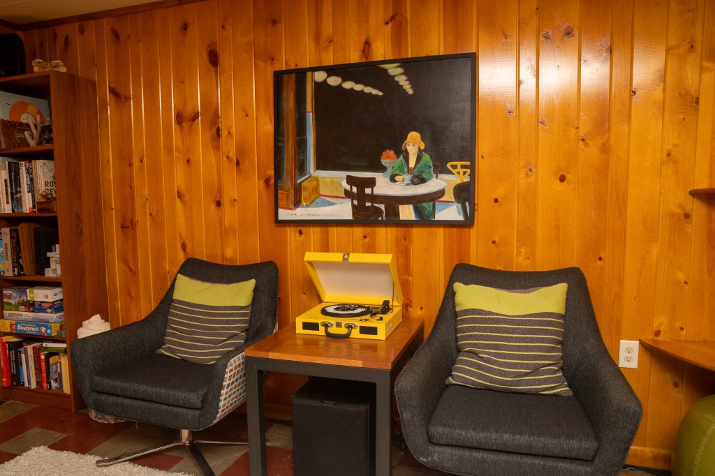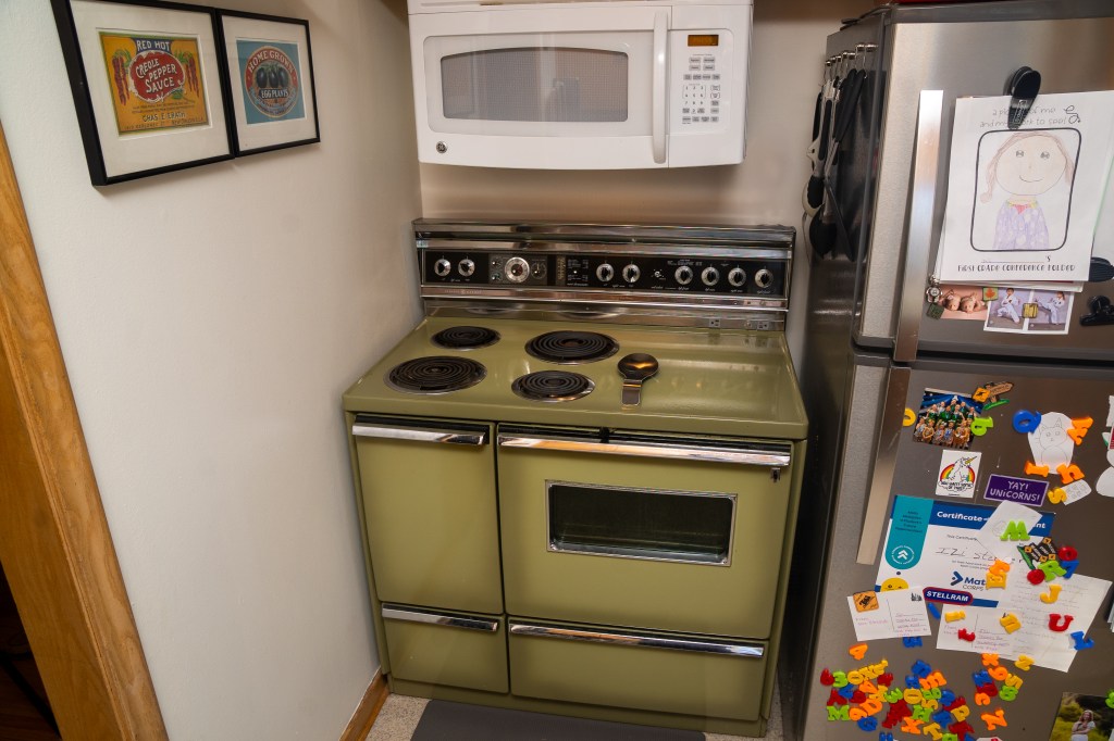 He bought his mid-century rambler in Minneapolis in 2022. There are original details like an avocado green stove, a wood-paneled basement, and huge picture window in the front. He loves many of the original details, including the avocado green stove, so he’s adapted his style to fit the space.