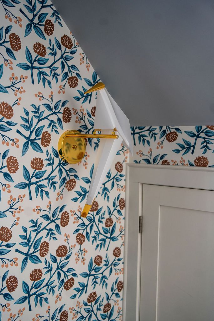 Along with the Hygge & West wallpaper in the kitchen, Leah had wallpaper installed in the stairway up to their upstairs suite. Photo by Jon Carnes
