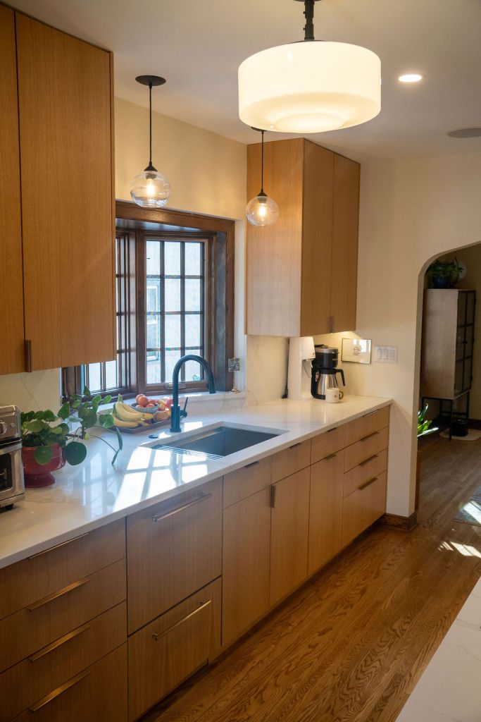 “It’s true what they say; everyone always wants to hover in the kitchen. So, we opened this up to have better sight lines and better light front to back. It can get dark in here later in the day, since all the windows are east-facing. So, having an archway keeps things a bit separate, but it’s open enough to let people hang out and bring the light in,” says Leah.
