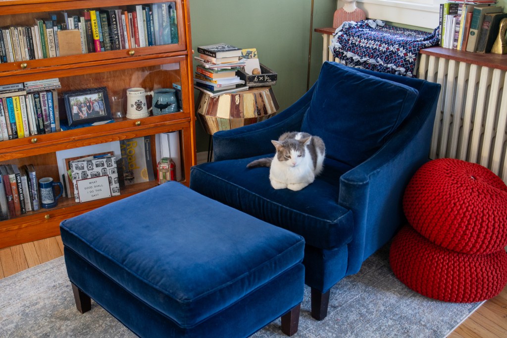 Rory lounges in a blue velvet chair next to a barrister cabinet Michelle’s dad made.