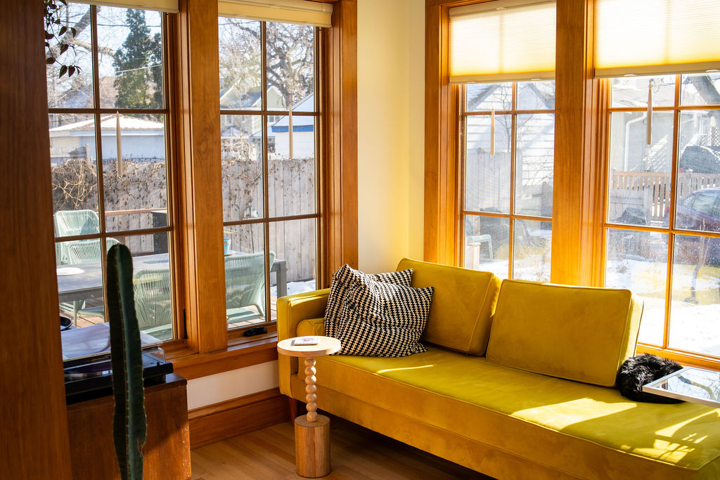 The front room has large windows on all three sides, and the windows in the front directly face the parkway, filling the room with light throughout the day. This has become the TV room and a play space for their 7-year-old daughter, Senja. The room also features colorful paintings by local artists Ashley Mary, Jennifer Davis, and former Minneapolis resident and artist Mikey Boss Dog. It connects to their living room with the fireplace and the dining room. The dining room is open to the kitchen and the recently added sunroom.