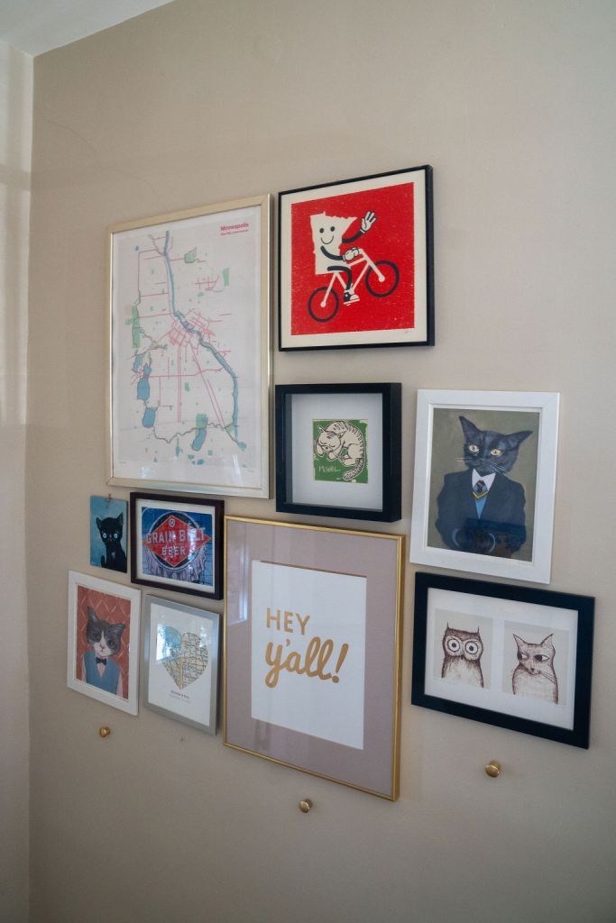Guests are greeted by a gallery wall of cat art in the entry.